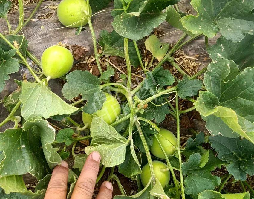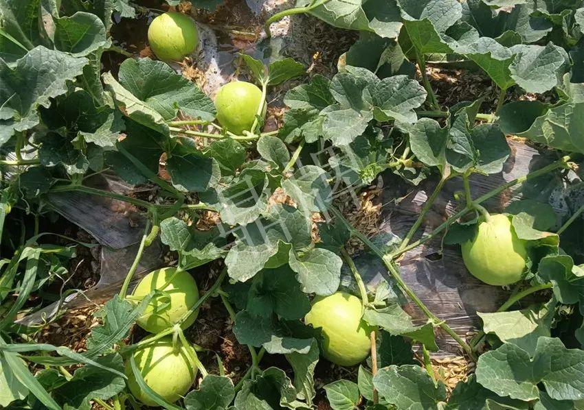 我們這里是從四月中旬開始麥茬套種甜瓜,為了讓甜瓜盡早上市,賣上好價錢,就在麥子收獲前定植。行距為1.9米、株距1米,甜瓜苗在未成熟的麥田中生長,寬行距有利于通風,以利瓜苗快速生長。