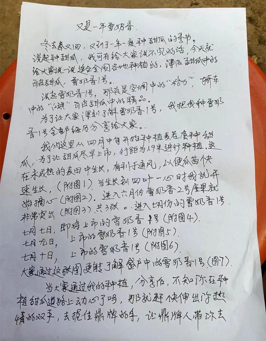 李老板是一位很務(wù)實、很勤奮的人,去年和今年都在麥田套栽了甜瓜,效益不錯。今年參加了鼎牌公司的“拍拍獎”活動,看他認真書寫的稿件就讓人敬佩。