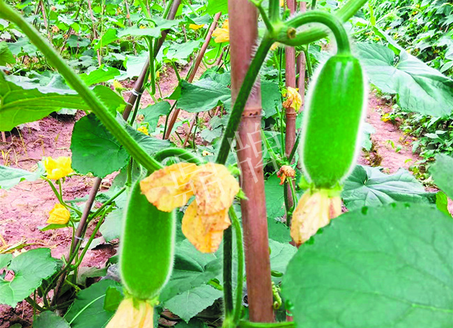 田間管理:去除所有側蔓,只留主蔓生長,為了減低坐果高度,主蔓向兩邊爬地后再上架,人字架交叉點離地面1.3米,便于果實膨大后自然垂落地面。