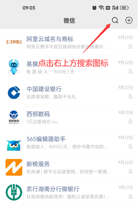 1、打開手機微信,點擊右上方“搜索圖標”,進入微信搜索頁。