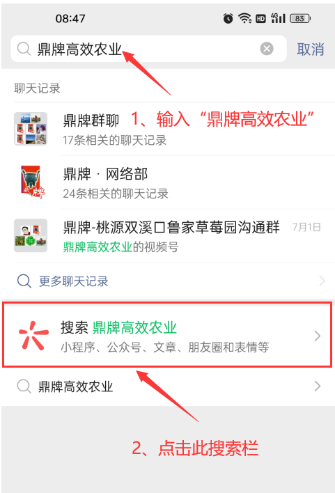 2、在輸入框輸入“鼎牌高效農業(yè)”,下方會出現“搜索欄”,點擊搜索。
