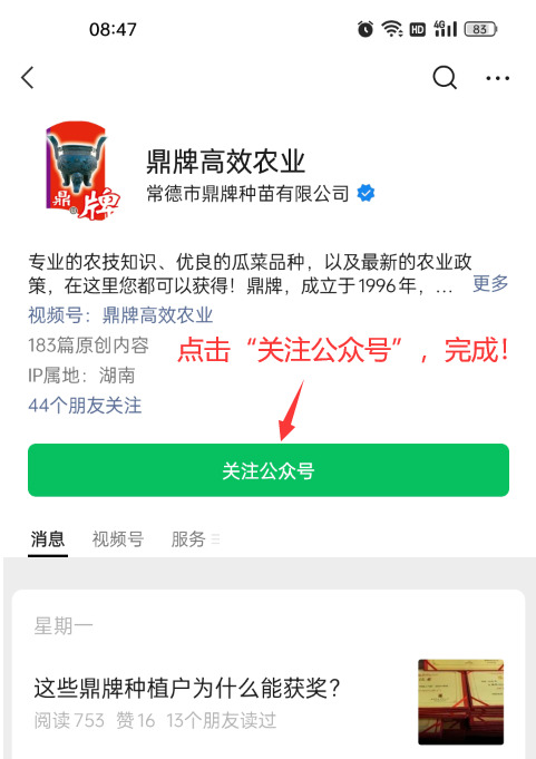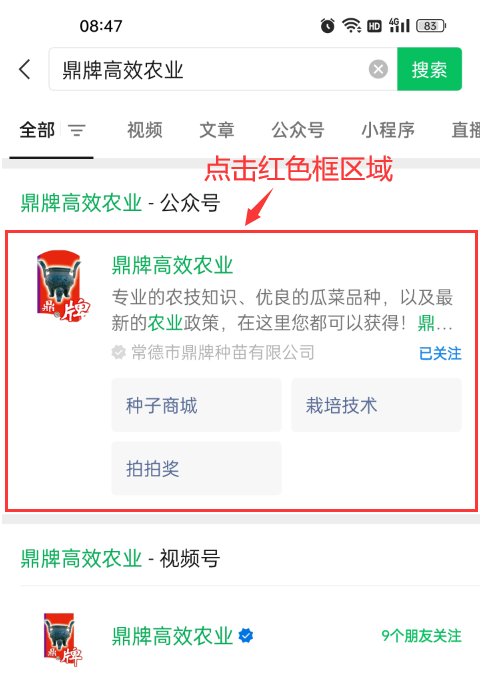 3、點擊紅色框區(qū)域的“鼎牌高效農業(yè)”公眾號信息,進入詳細頁面。
